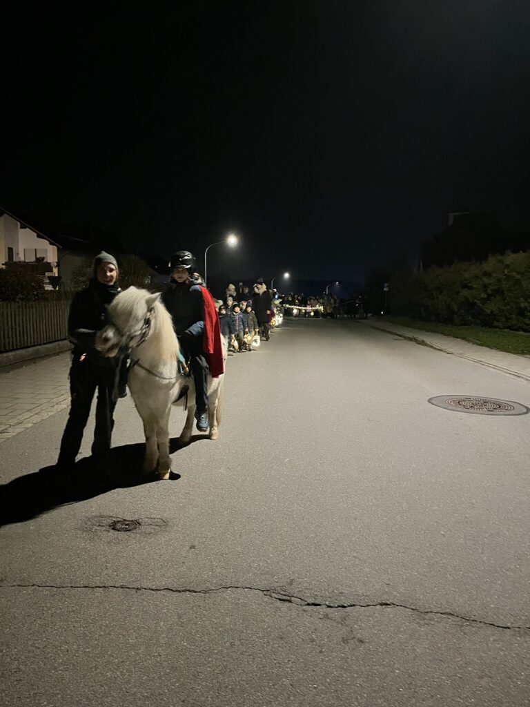Gemeinsam zogen unsere Kindergartenkinder mit ihren leuchtenden Laternen in die Kirche ein. Gemeinsam mit Pfarrvikar Pascal gestalteten die pfiffigen Füchse und die schlauen Tiger den Gottesdienst. Die flotten Mäuse und die flinken Käfer, sowie die Kinder der Mäusegruppe schauten zusammen mit ihren Eltern gespannt zu. Nach einem tollem Rollenspiel, verschiedenen Liedern und Tänzen, zogen sie Großen gemeinsam mit den Erzieherinnen aus der Kirche aus. Im Anschluss folgten all die anderen Gottesdienstbesucher. Angeführt von St. Martin auf seinem Pferd (vielen Dank an dieser Stelle an Familie Hofmann mit der Reiterin Josefine Hofmann), starteten wir unseren Laternenumzug Richtung Kindergarten. Andy Fischer und seine Tochter Anna-Maria begleiteten den Gottesdienst und den Umzug wie jedes Jahr mit schönen Martinsliedern. Im Kindergarten angekommen versammelten wir uns ums Feuer und sangen zum Abschluss noch gemeinsam ‚Laterne Laterne, Sonne, Mond und Sterne..‘ . Anschließend konnten Kinder und Eltern, ehemalige Kindergartenfamilien und Dorfbewohner noch die Zeit mit Kinderpunsch, Glühwein, sowie Bratwürstl und Knackersemmeln genießen. Wer Lust hatte, konnte ebenfalls noch Hefezopf und Martinsgänse genießen.