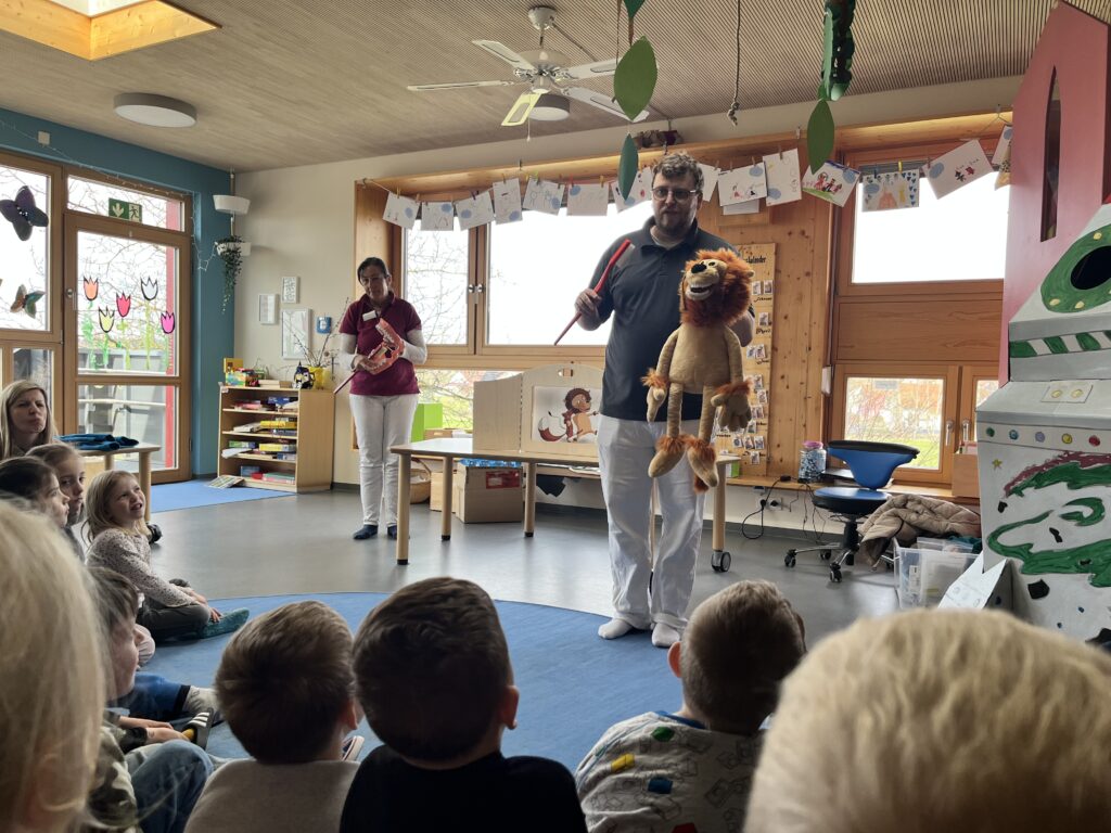 Sie besuchten jede Gruppe einzeln und erzählten uns Kindern ganz viel über die Zähne. Es ist zum Beispiel ganz wichtig, nicht so viele Süßigkeiten zu essen, denn das tut unseren Zähnen garnicht gut. Wir Kinder wussten auch schon, welche Sachen richtig gesunde Lebensmittel sind. Diese sollten wir oft essen, die sind sehr gut für unsere Zähne. Der Zahnarzt brachte uns eine Geschichte mit, indem ein Junge seine Zahnputzsachen verlor. Ein kleiner Fuchs fand die Sachen und stellte ziemlich lustige Sachen mit der Zahnbürste an. Er kämmte sogar sein Fell damit. Der Junge zeigte dem Fuchs aber wie‘s richtig geht. Und uns half der lustige Löwe vom Zahnarzt und zeigte und mit einem tollen Lied genau, wie richtig Zähneputzen geht.
