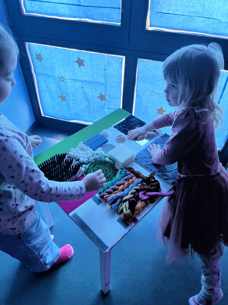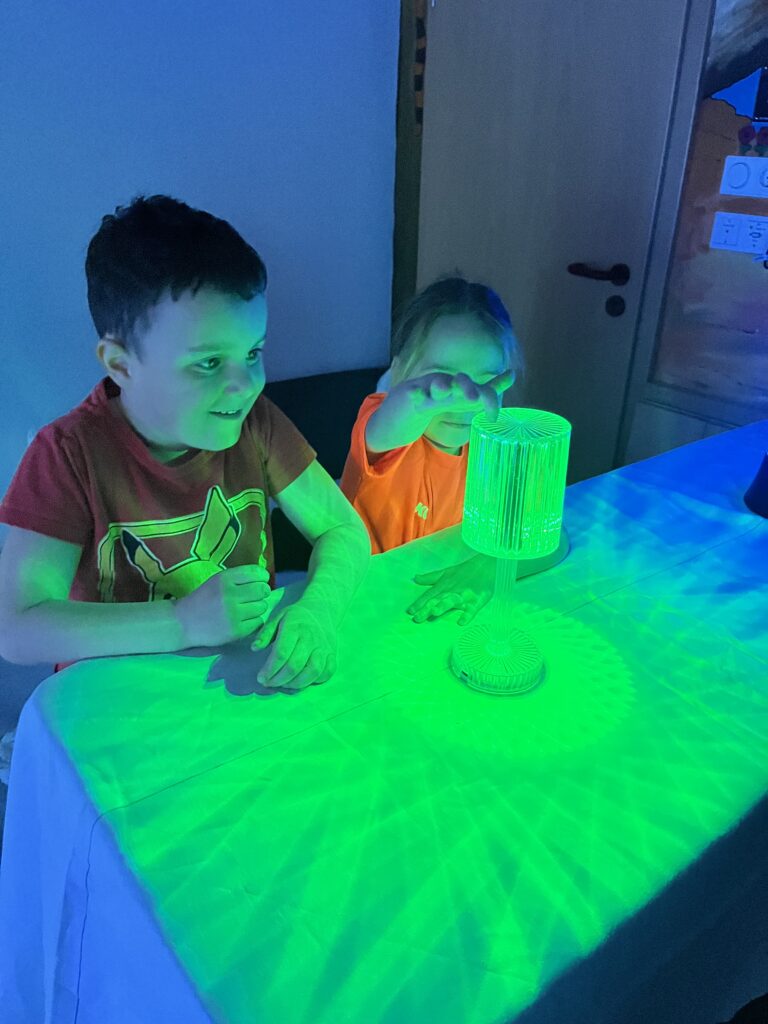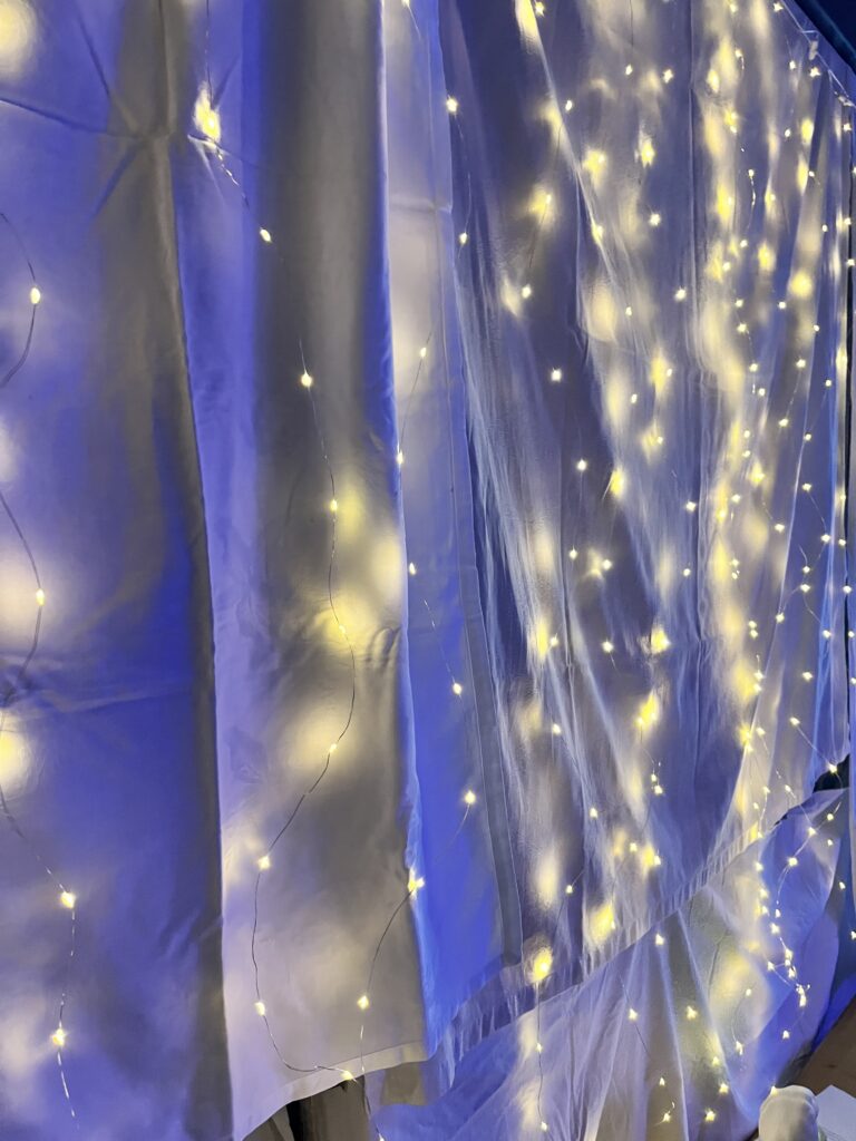 Unsere Turnhalle wurde abgedunkelt, gemütlich gemacht und mit kuscheligen Entspannungsmöglichkeiten und tollen Lichtern ausgestattet. Die Kinder konnten so die Turnhalle bei Entspannungsmusik frei erkunden und diesen Raum nutzen. Anstatt der Turntage konnte jede Gruppe den Raum dann individuell für Entspannung nutzen. Das war eine tolle Erfahrung.